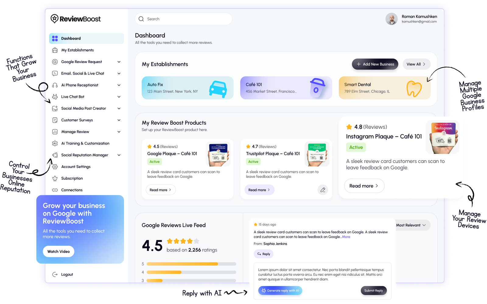 Get started in minutes. Connect your platforms, customize your settings, and let ReviewBoost.ai automate your customer interaction and reputation management. Experience tangible results immediately.