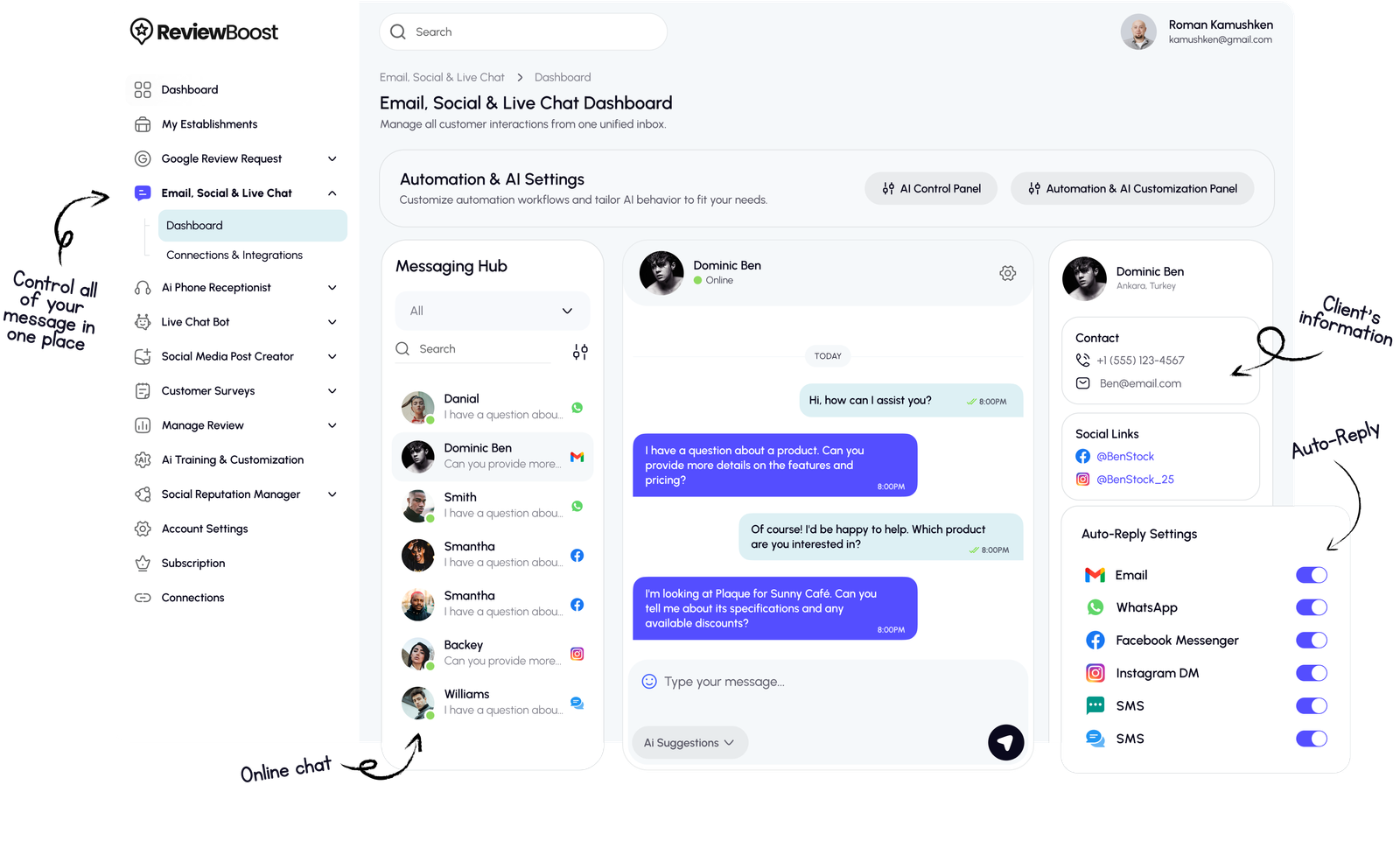 The social reputation manager alone paid for itself in the first week. Our Facebook ads were getting destroyed by spam comments, killing our conversion rates. Now ReviewBoost.ai automatically hides negative comments and turns inquiries into private messages. Our ad ROI improved 60% and the AI keeps creating content that actually sells products.