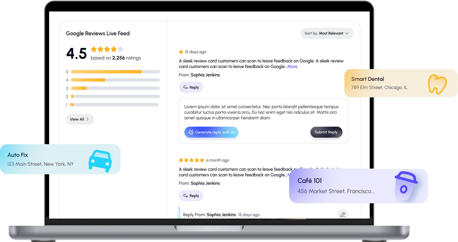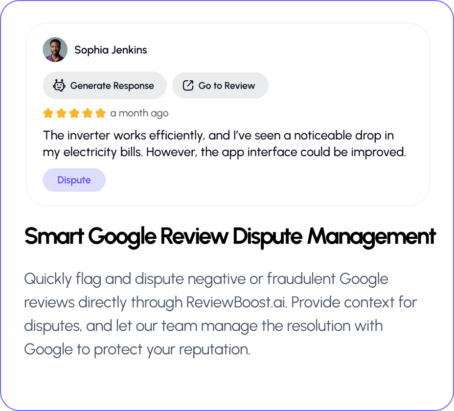 Centralize and automate your review management process. Automatically collect new Google reviews, easily reply to customer feedback, dispute negative ones, and maintain your stellar online reputation effortlessly.